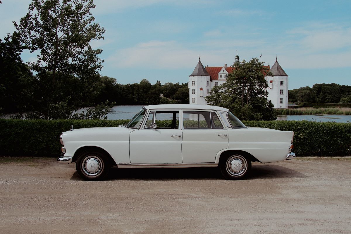 Auch viele Hochzeitspaare entscheiden sich für den Glanz unseres Straßenkreuzers mit Heckflosse. Seine elegante Farbkombination in weiß mit blauer Innenausstattung passt zu fast allem. Auf der geräumigen Rückbank ist genug Platz für jedes noch so ausladende Brautkleid. Und auf den Hochzeitsfotos ist der 200 D der perfekte Hintergrund für jedes Traumpaar. Mit der weißen Heckflosse ist man immer gut angezogen!