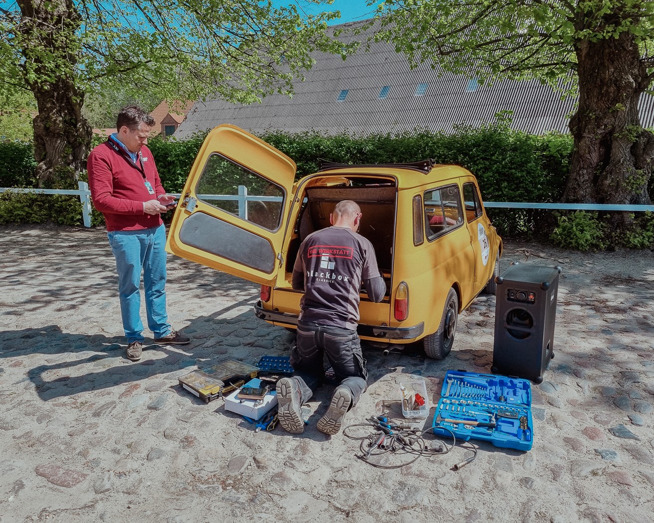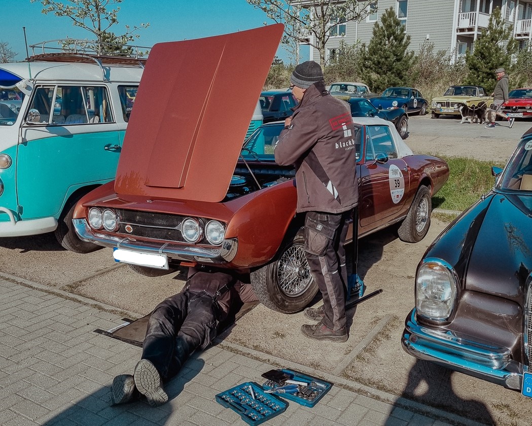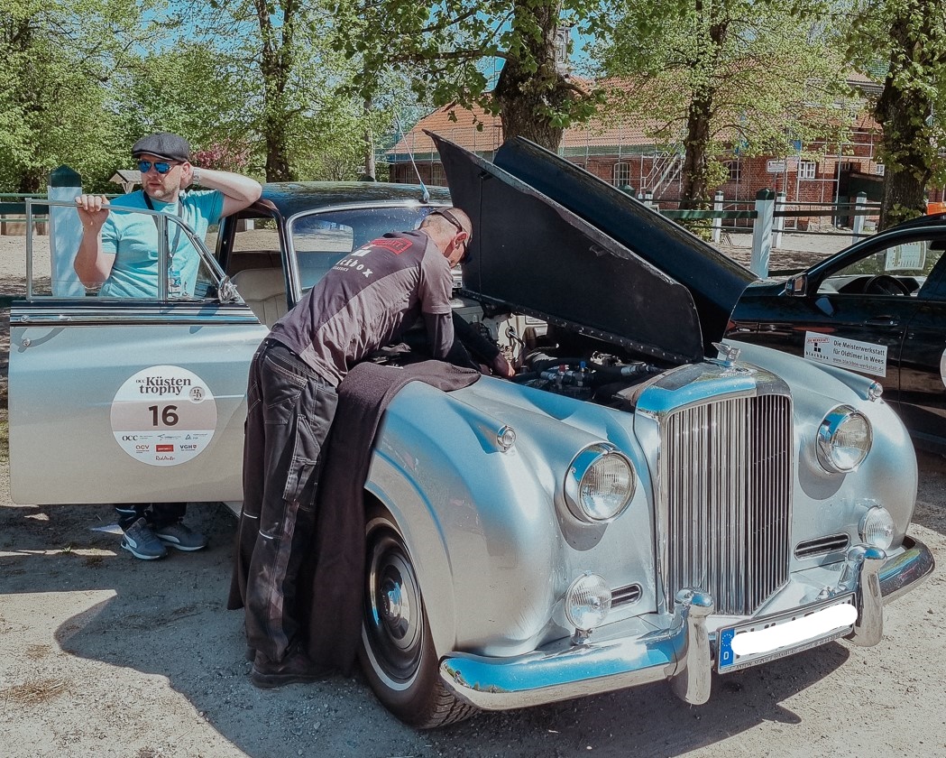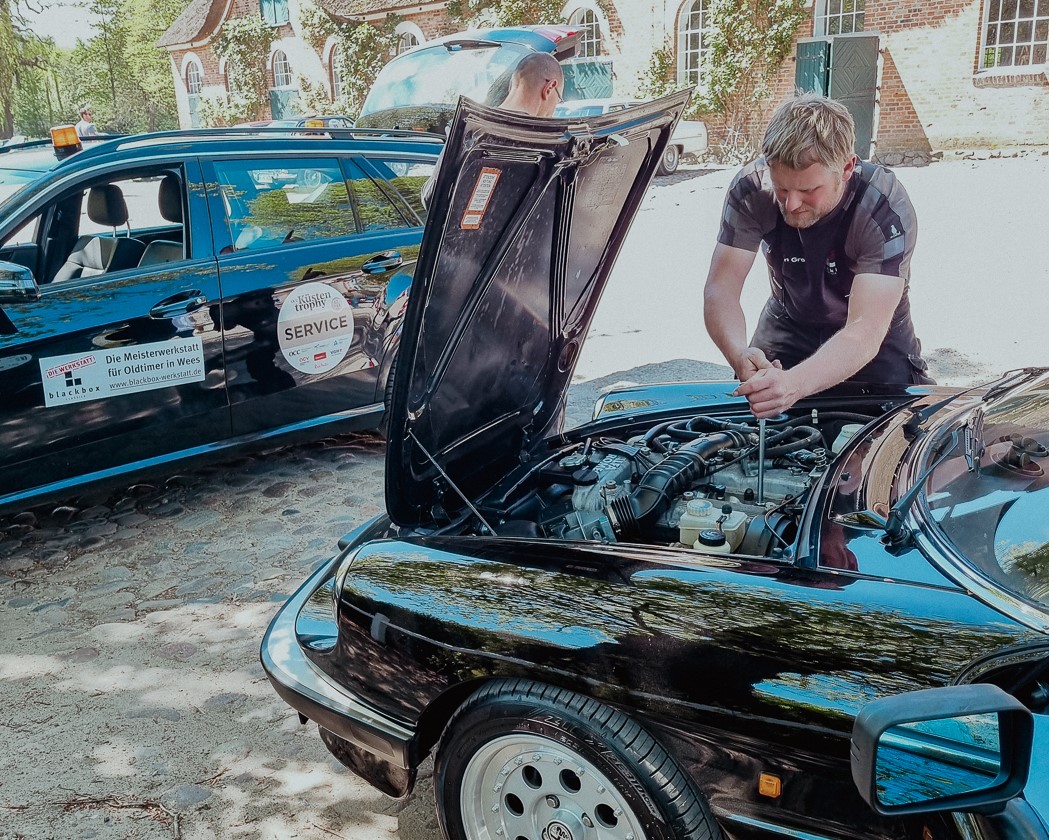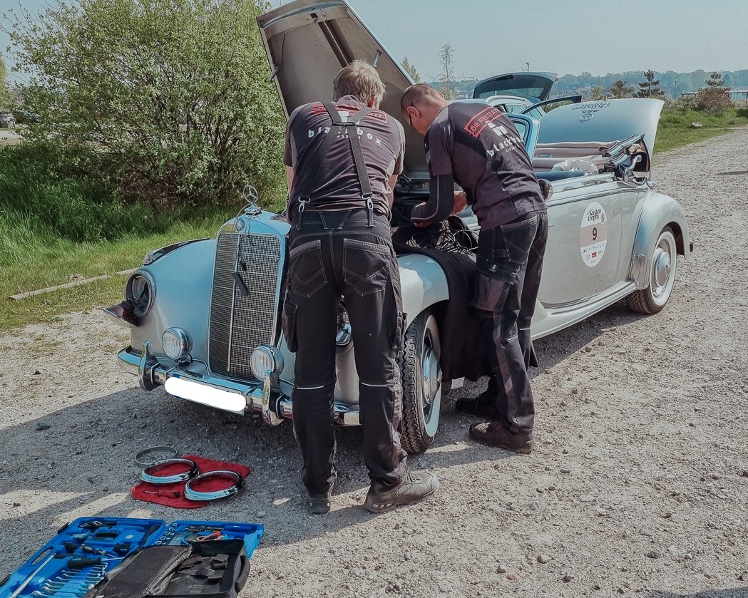 Unsere Mechaniker haben tagtäglich mit den Tücken von alten Fahrzeugen zu tun und kennen sich mit vielen verschiedenen Autotypen aus. Anstatt das Fahrzeug in die nächste Werkstatt zu schleppen, hat unser Rallye-Team alles dabei, um auf der Strecke Hilfe zu leisten. Dafür führen wir Verbrauchsmaterial wie Öle, Treibstoff, Kühlwasser, Bremsflüssigkeit etc. mit. Auch gängige Verschleißteile wie Schläuche, Kabel, Benzinfilter und Zündspulen sind an Bord. So können die Teilnehmer trotz Panne in der Regel ihre Rallye fortsetzen. Falls doch keine Reparatur möglich ist, haben wir auf unserem historischen LKW einen Ersatzoldtimer dabei, mit dem die Teilnehmer ihre Fahrt fortsetzen können. So können Ihre Kunden trotz Panne ihre Rallye genießen und werden die Veranstaltung in guter Erinnerung behalten