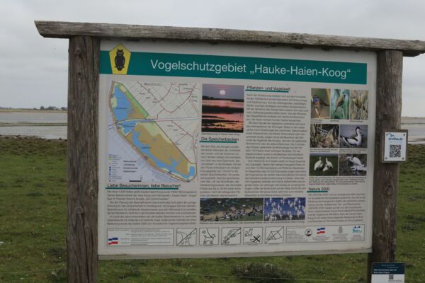 Das nächste Ziel ist der Hauke Haien Koog, benannt nach dem Deichgrafen aus Theodor Storms Novelle „Der Schimmelreiter“. Der Außendeich ist mit einer Straße erschlossen, an der es zahlreiche Aussichtspunkte gibt, um die Vögel auf der Innenseite zu beobachten und die Nordsee auf der Außenseite. Ein Teil des Kooges ist als Speicherbecken konzipiert und fungiert heute als Schutzgebiet für Seevögel. Während des Vogelzuges dient der Koog besonders zahlreichen Entenarten als Rastplatz. Er ist jedoch auch Brutplatz für Seeschwalben, Sandregenpfeifer und Säbelschnäbler.
