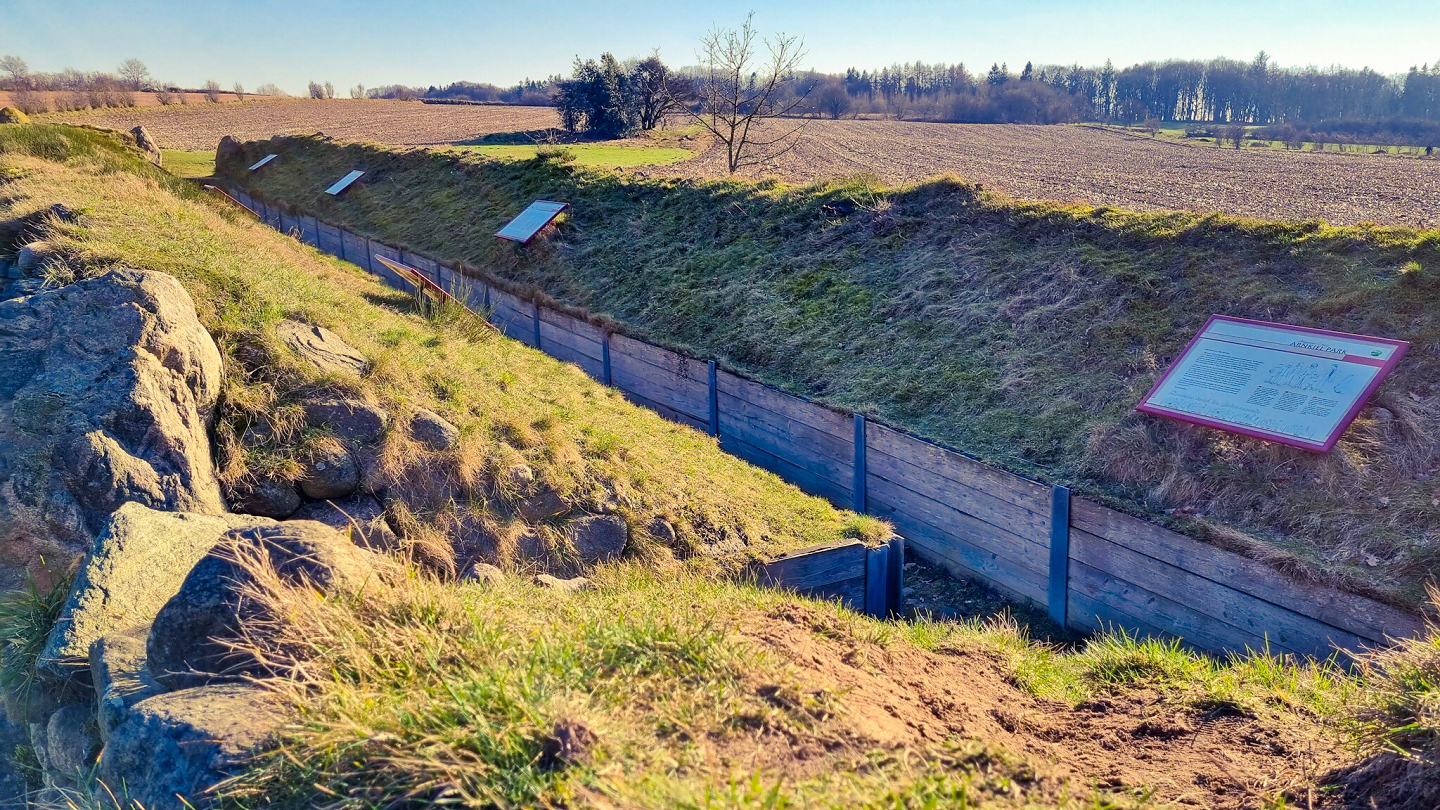 Der erste Stopp ist der Arnkiel Park in Munkwolstrup. Hier befinden sich mehrere Großsteingräber, darunter ein rekonstruiertes Hünenbett. Die Megalithanlagen der Trichterbecherkultur entstanden zwischen 3500 und 2800 v. Chr. Viele Tafeln informieren über die Erbauer und das Leben der Menschen vor 5000 Jahren. Hier bekommt man einen guten ersten Überblick, was einen auf der weiteren Tour erwartet. Die Anlagen wurden schon im 17. Jahrhundert dokumentiert und Anfang der 2000er restauriert. Weiter geht es nach Süden die B76 entlang.